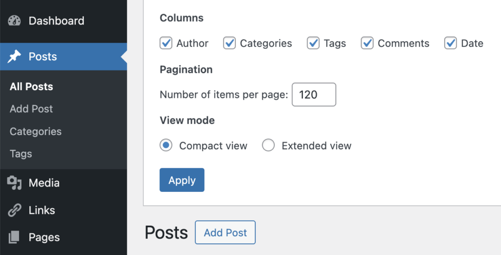 By default WordPress only shows 20 items per page on admin screens. That’s way too low to be convenient, so I always update it to a more reasonable number, like 120. I end up having to do that on every screen on every site I work with, though, which is tedious.